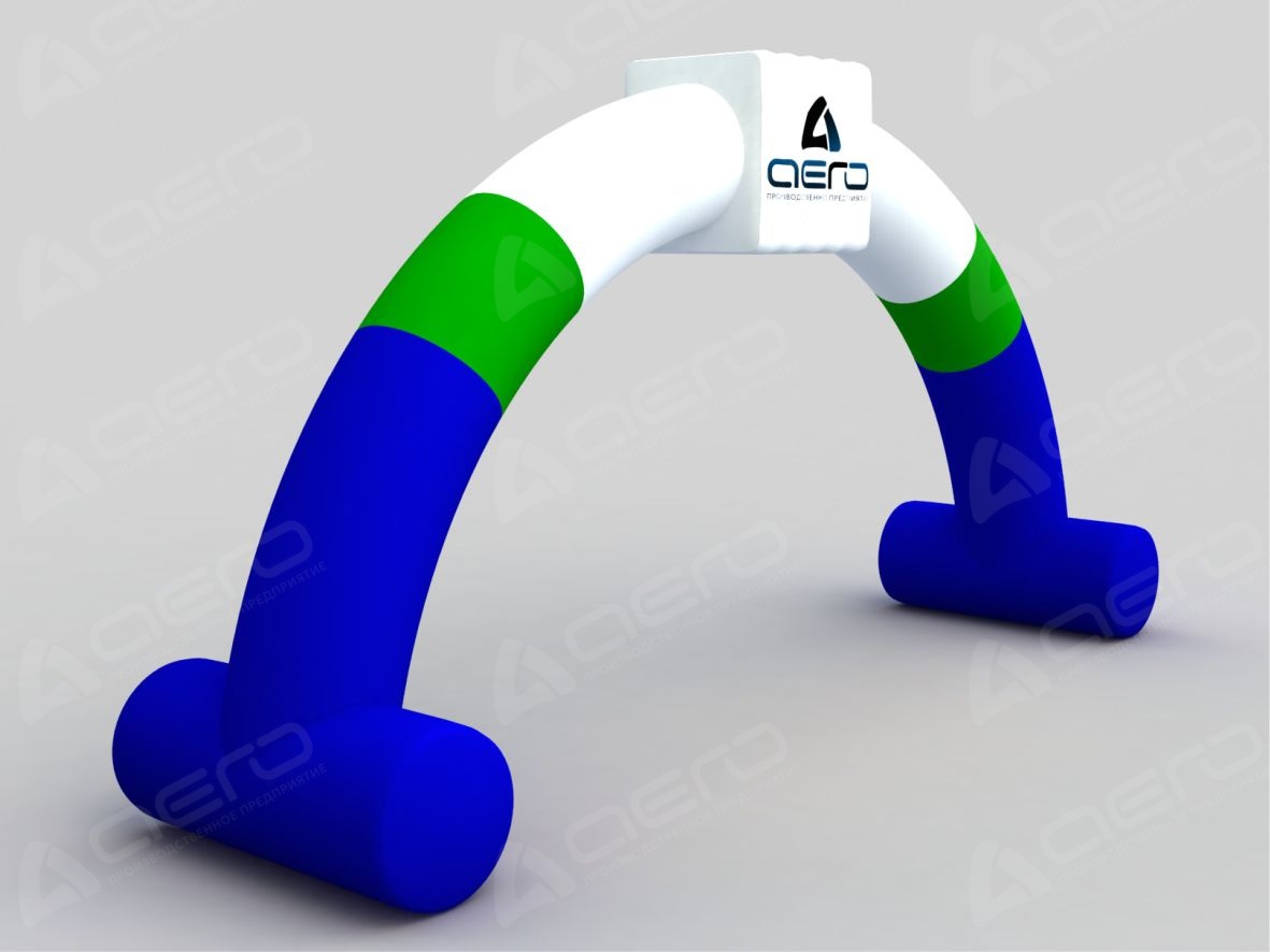 Современная форма надувной арки имеет классическую круглую форму, но с добавлением устойчивых опор и объёмного элемента по центру (форму элемента подберём под ваш логотип).