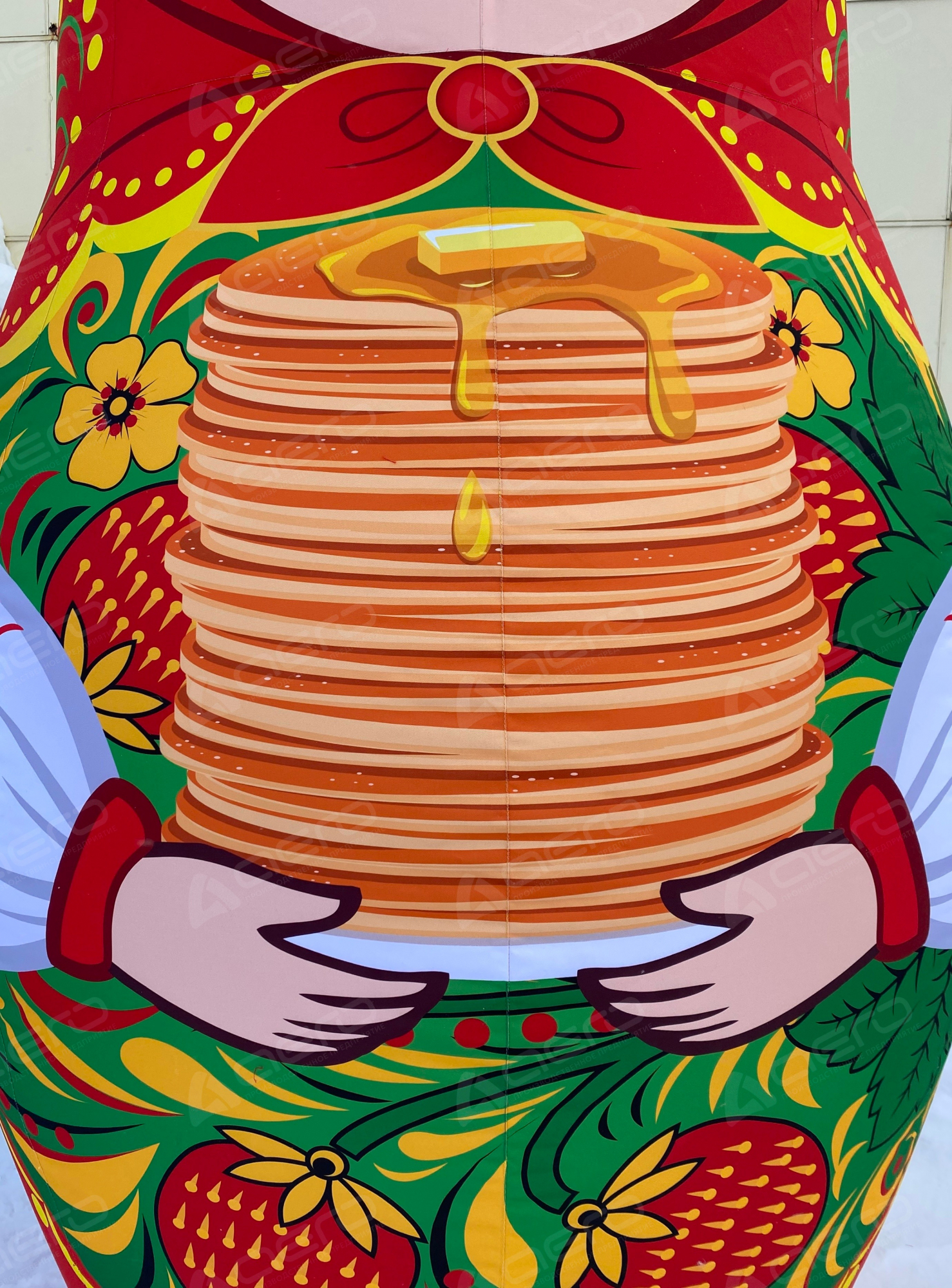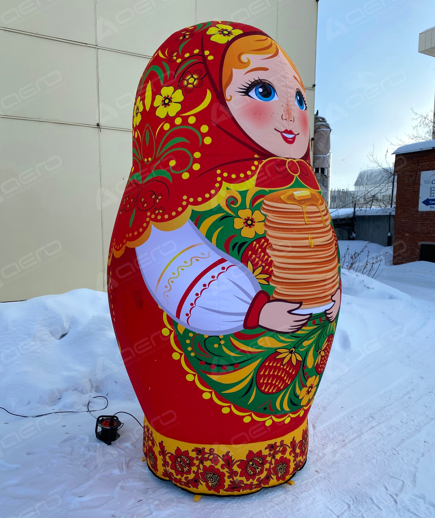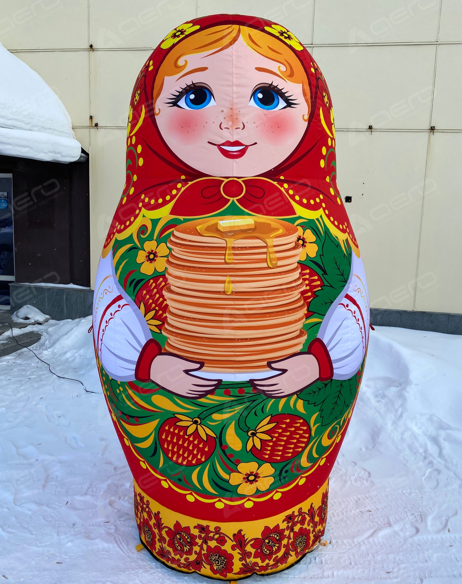 Большая надувная матрёшка держит в руках стопку золотистых блинов — главный символ Масленицы. Такой образ сразу вызывает улыбку и ощущение настоящего русского праздника с его щедростью, радостью и гостеприимством.