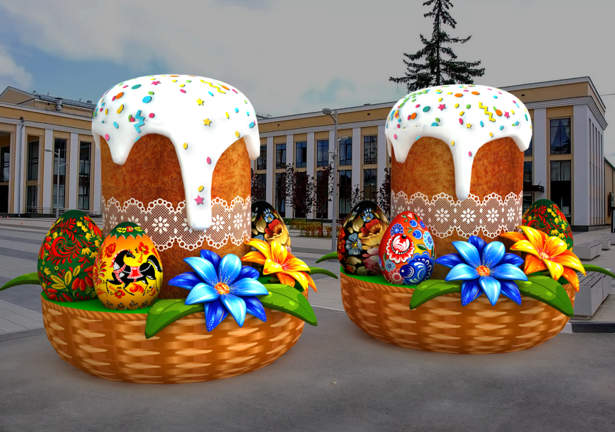 Дизайн фигуры тщательно продуман: пышный, украшенный глазурью и разноцветной посыпкой надувной кулич возвышается над яркими, расписанными замысловатыми узорами яйцами. Цвета подобраны таким образом, чтобы радовать глаз и создавать ощущение праздника.