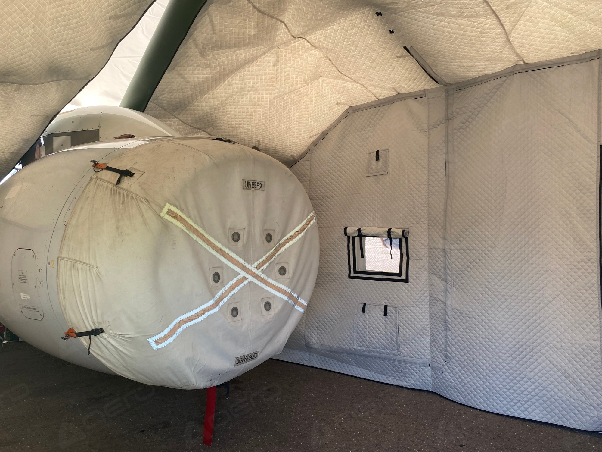 Для того, чтобы сократить задержки при внеплановом техническом обслуживании двигателей, можно доставить надувное укрытие к нуждающемуся самолету, а не наоборот. Пневмоукрытие легко транспортируется и устанавливается за считанные минуты, что экономит время и ресурсы.