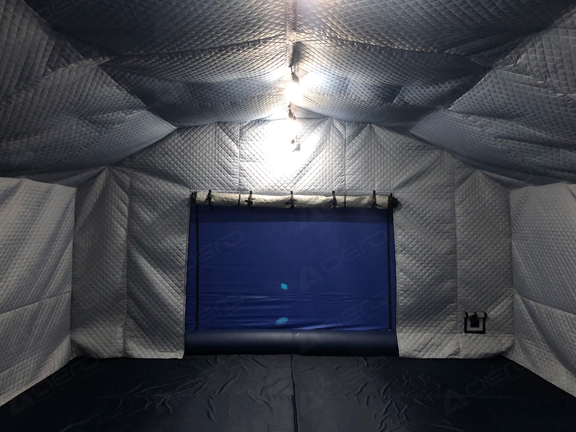 Выполнен из морозостойкой водонепроницаемой ПВХ ткани 630-650 г/м2. Тент несъёмный. С каждой стороны имеется крепёж для растяжек к грунту, для большей устойчивости на ветреной местности, а также ручки для переноса палатки в надутом виде. Слева от пневмодвери расположен информационный карман А4. |