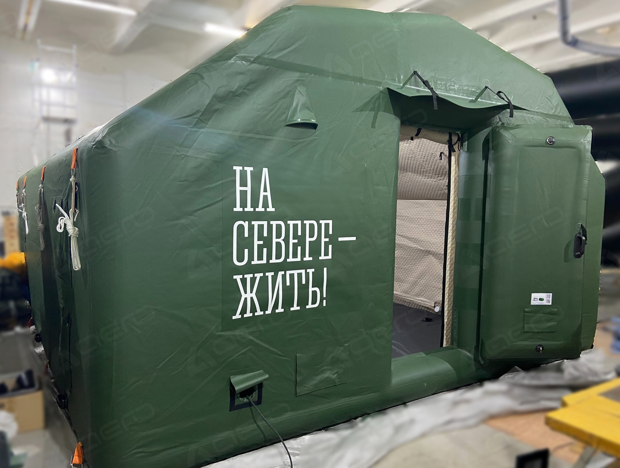 Выполнен из морозостойкой водонепроницаемой ПВХ ткани 630-650 г/м2. Тент несъёмный. С каждой стороны имеется крепёж для растяжек к грунту, для большей устойчивости на ветреной местности, а также ручки для переноса палатки в надутом виде. Слева от пневмодвери расположен информационный карман А4. |