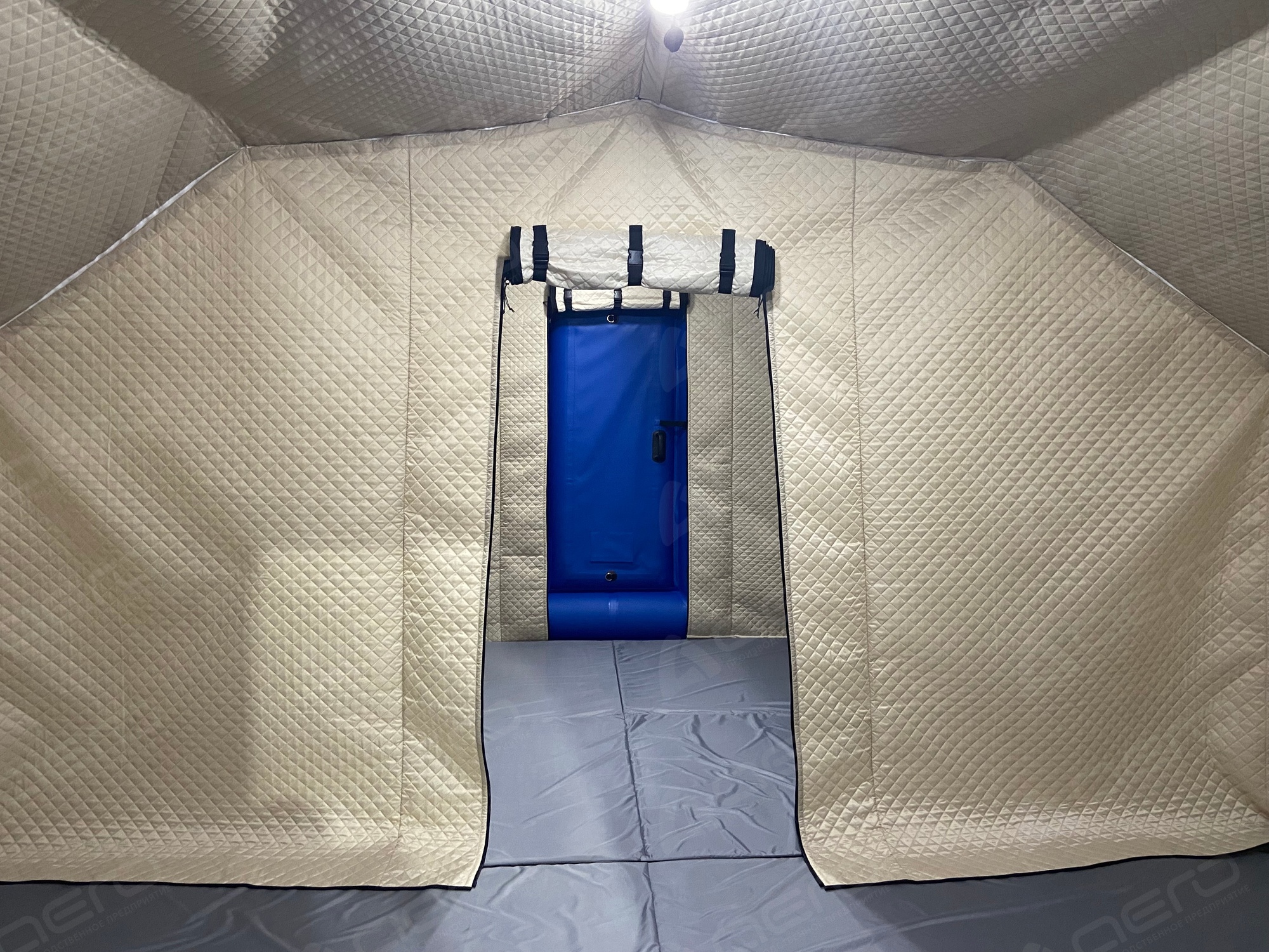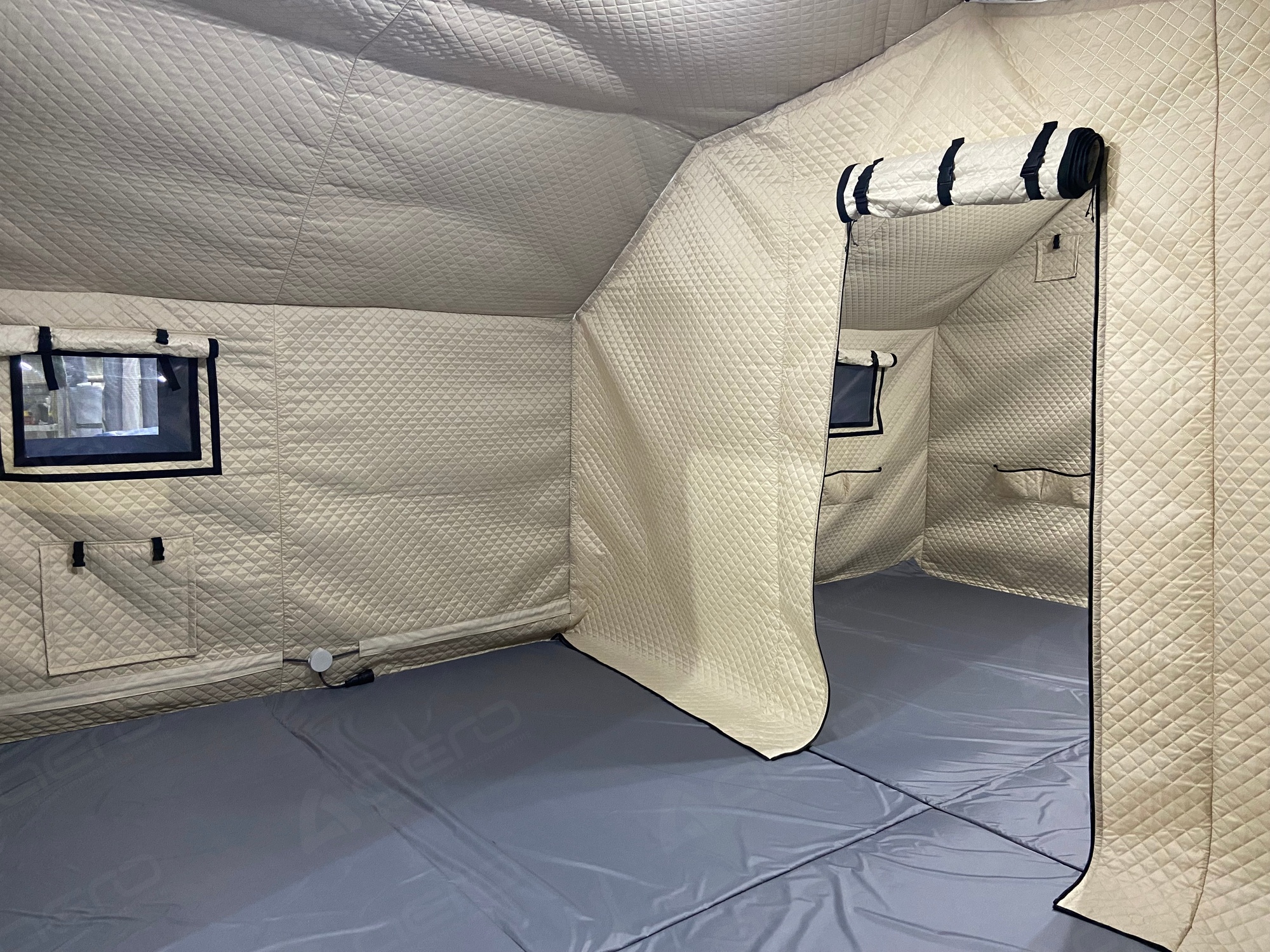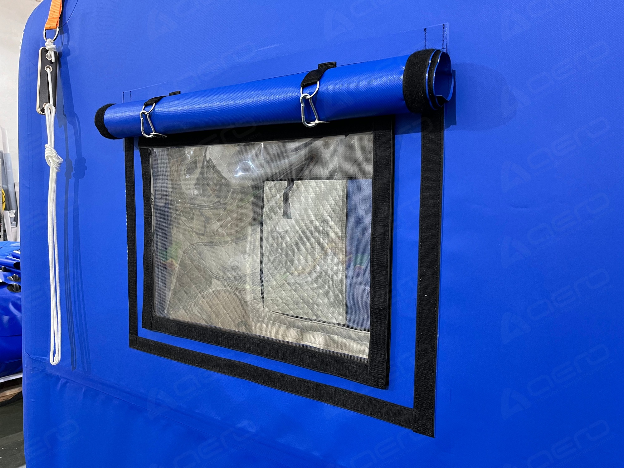 Выполнен из морозостойкой водонепроницаемой ПВХ ткани 630-650 г/м2. Тент несъёмный. С каждой стороны имеется крепёж для растяжек к грунту, для большей устойчивости на ветреной местности, а также ручки для переноса палатки в надутом виде. Слева от пневмодвери расположен информационный карман А4. |