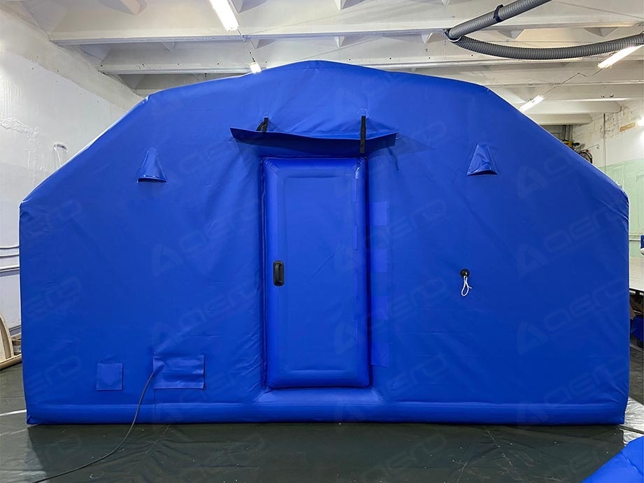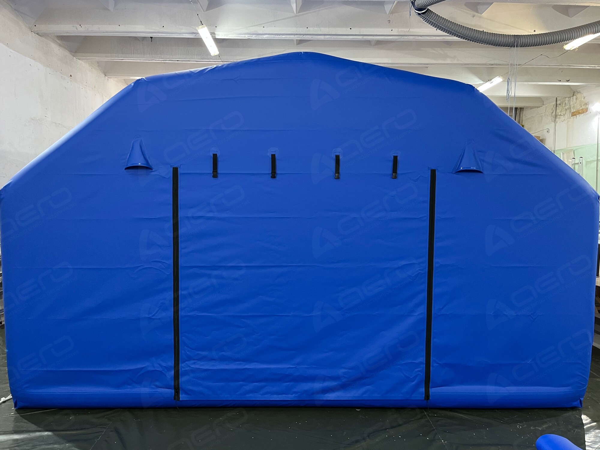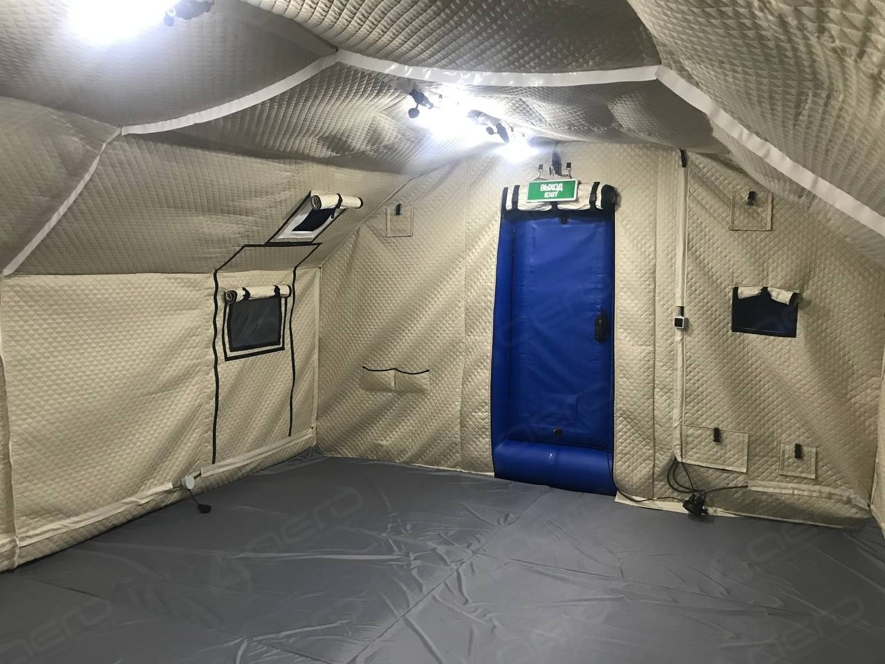 Выполнен из морозостойкой водонепроницаемой ПВХ ткани 630-650 г/м2. Тент несъёмный. С каждой стороны имеется крепёж для растяжек к грунту, для большей устойчивости на ветреной местности, а также ручки для переноса палатки в надутом виде. Слева от пневмодвери расположен информационный карман А4. |