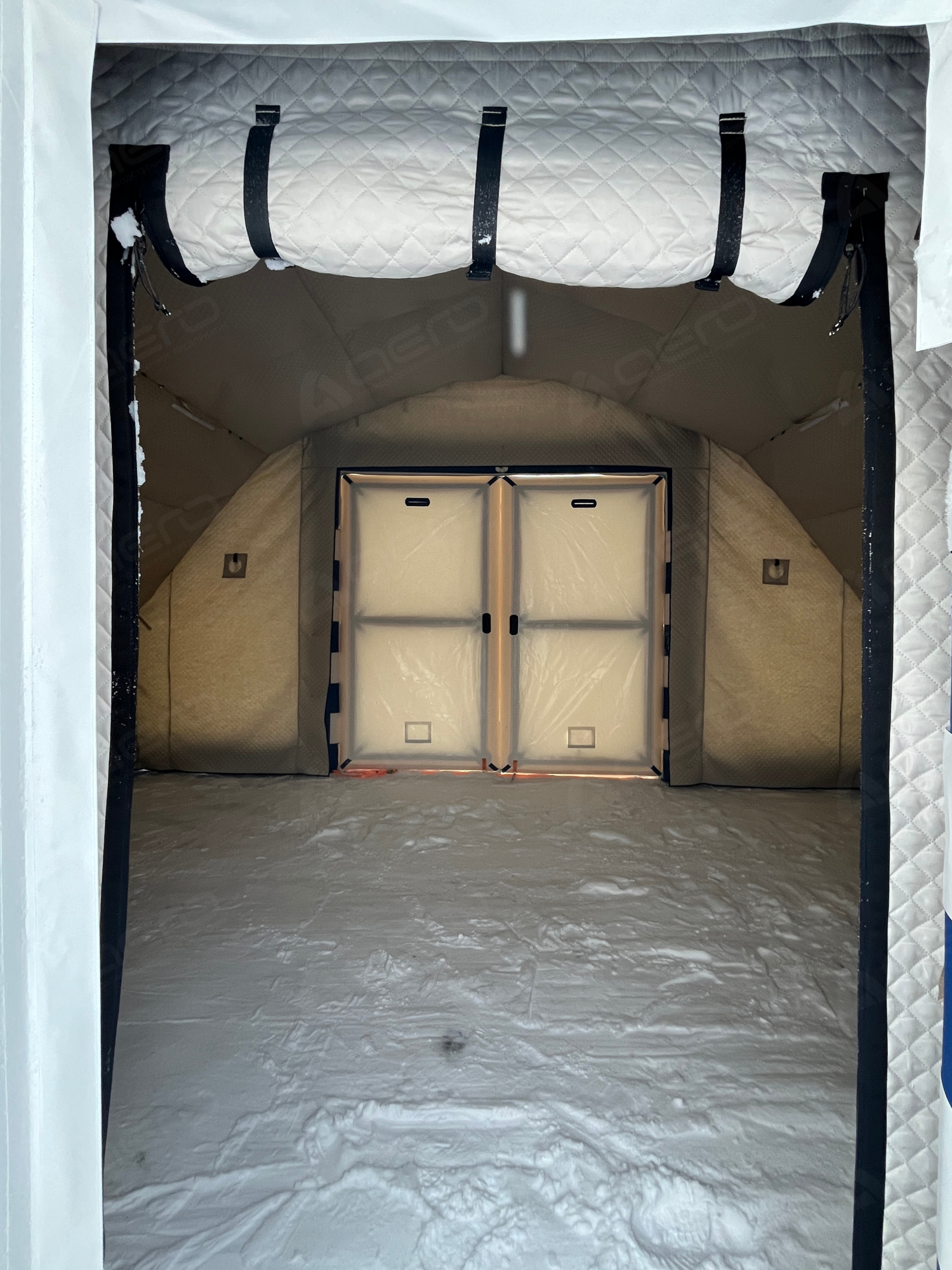 Имеет надувной каркас и отдельный клапан для надува. Размер двери 1,8м.*0,8м. Внутренняя и внешняя сторона двери выполнены из материала внешнего тента. Фиксируется в открытом положении, а также в закрытом при помощи застёжки фастекс.